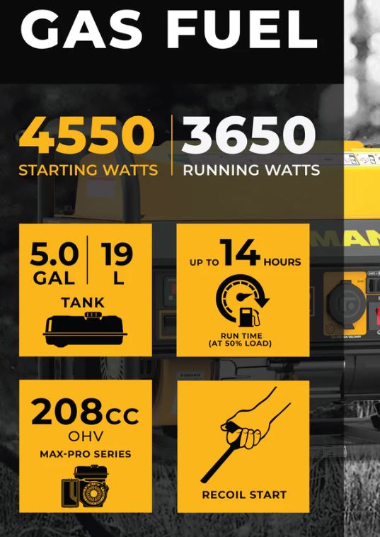 The FIRMAN P03605 is a durable, RV-ready portable gasoline generator built for camping, job sites, and emergency home power. Powered by a 208cc Max Pro engine with a Phoenix Fat Head Block, it delivers 4550 starting watts and 3650 running watts while operating at a quiet 67 dB. Its 5-gallon steel tank provides an impressive 14-hour runtime at 50% load, making it one of the longest-running generators in its class. With clean power output, 120/240V capability, and multiple covered outlets, it reliably supports tools, appliances, and sensitive electronics. It also includes safety-focused features such as automatic low-oil shutoff and a USDA-certified spark arrestor for safer use in forested and rugged environments.