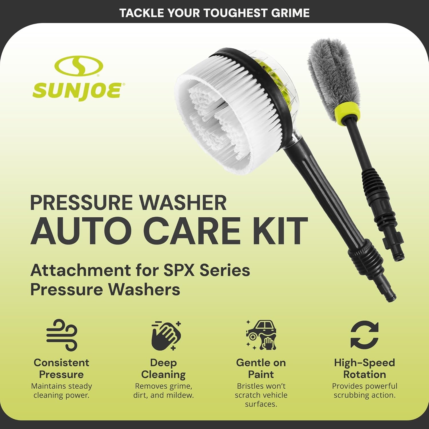 Transform your outdoor cleaning with the Sun Joe Car Care Accessory Kit, a high-powered bundle built for tackling grime on your car, patio furniture, siding, windows, RV, and more. Designed for use with the SPX Series pressure washers, this accessory kit combines the force of water with brush scrubbing action to lift away stubborn dirt. The fine bristle brushes work seamlessly to clean deep into crevices where standard tools fail. Simply attach the rotary wash brush or wheel rim brush to your compatible pressure washer and let the water-powered design deliver maximum cleaning power with minimal effort. Whether you're working on greasy wheel wells or dusty patio chairs, the brushes apply consistent scrubbing strength across every surface, giving your outdoor tools and auto body parts a showroom-quality finish. Each brush is engineered for durability, featuring sturdy construction and pressure-activated performance to make your cleaning routine more efficient. The soft yet effective bristles target stubborn grime without damaging delicate surfaces, and the included transfer adapter makes it easy to switch between accessories with ease. With sleek, colorful accents and a universal fit for SPX Series models, the Sun Joe Car Care Accessory Kit is your go-to tool for outdoor cleaning and automotive maintenance. Blast away messes, simplify detailing, and keep every surface looking its best.