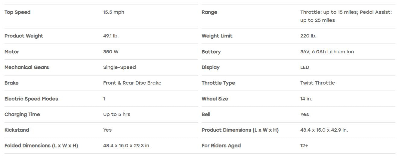 - Swift & Steady: The 350-watt hub motor can take you up to 15.5 mph, and the 36V 6.0 Ah battery will get you up to 15 miles with the throttle – more if you ride with pedal assist -- before it’s time to recharge. The battery indicator lights will keep you in-the-know on how much charge remains.