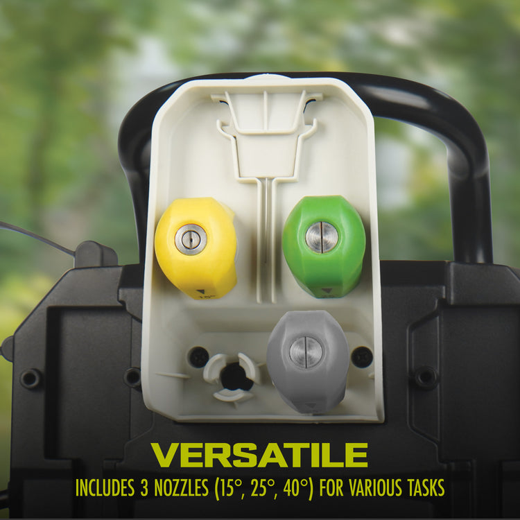• Versatile: Includes three quick-connect nozzles (15°, 25°, 40°) to tackle various cleaning jobs